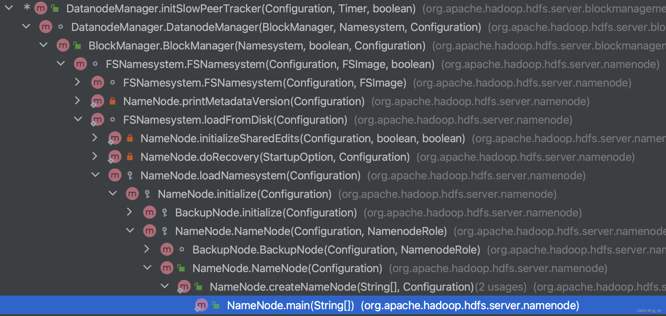 这里出现了一个陌生的变量slowPeerTracker,让我们看下它是如何构造的,首先看到是在initSlowPeerTracker来赋值的,所以查看下调用栈发现是在NameNode启动时一路调用过来的,initSlowPeerTracker里初始化了allReport对象,所以addReport就是把节点信息加入到allReport中。