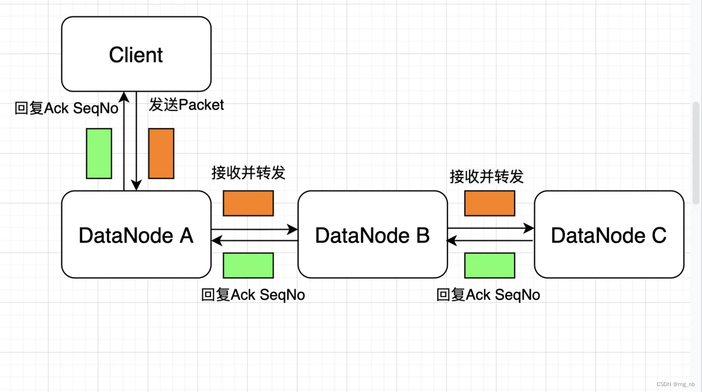 在从客户端提交写入文件的请求后,NameNode需要选择出一些适合的DataNode,将这些DataNode放入一个Pipeline中。NameNode会与Pipeline中的第一个DataNode交互(发送Packet),接下来第一个DataNode会将Packet发送到Pipeline中的第二个DataNode,以此类推直到最后一个DataNode。当Pipeline中的最下游节点收到数据包后,会按照数据包传送方向的反方向发送对数据包的Ack信息。这个Ack信息是一个数据包的序列号,在Client侧是单调递增的。参考下图: